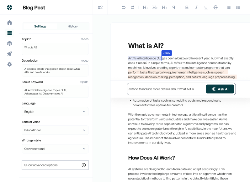 Use AI across tasks to ensure consistency, efficiency, and tailored content creation, no matter your project type.