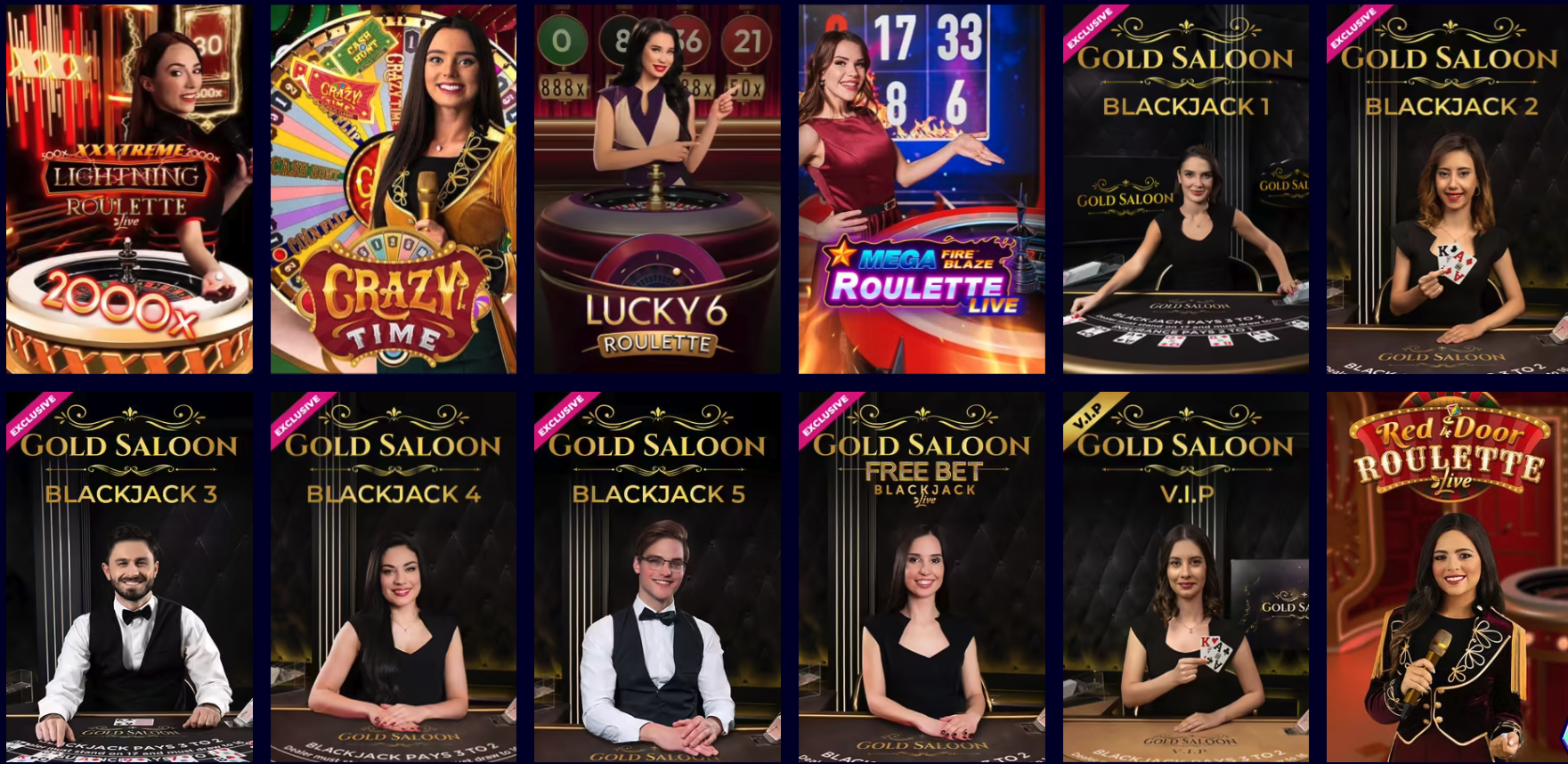Juegos de azar en vivo: Más de 500 salas con crupieres humanos para ruleta en vivo, blackjack y juegos de mesa inmersivos como Crazy Time.